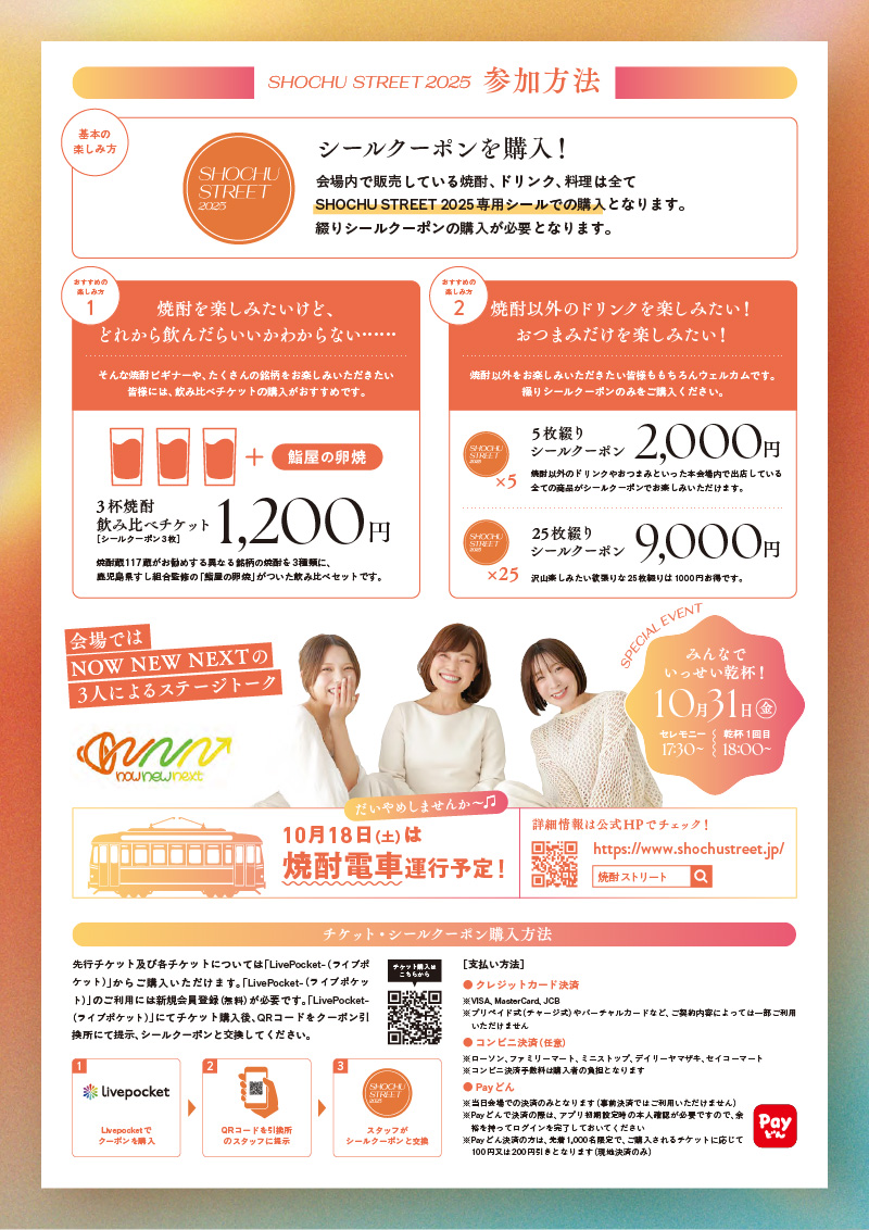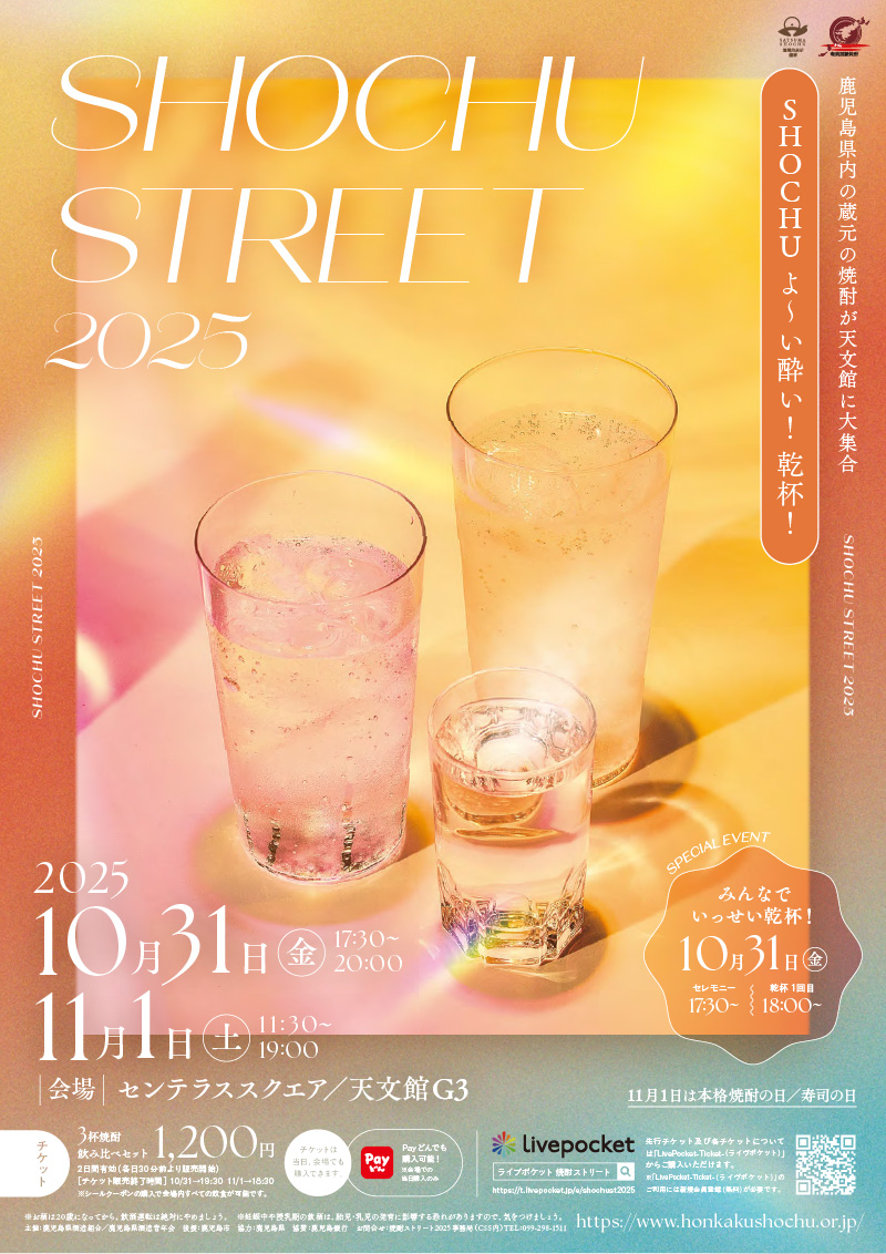 11月1日の「本格焼酎の日」に合わせて、10月31日(金)と11月1日(土)の2日間、県内の焼酎が天文館に集結し、「焼酎ストリート2025」を開催いたします。