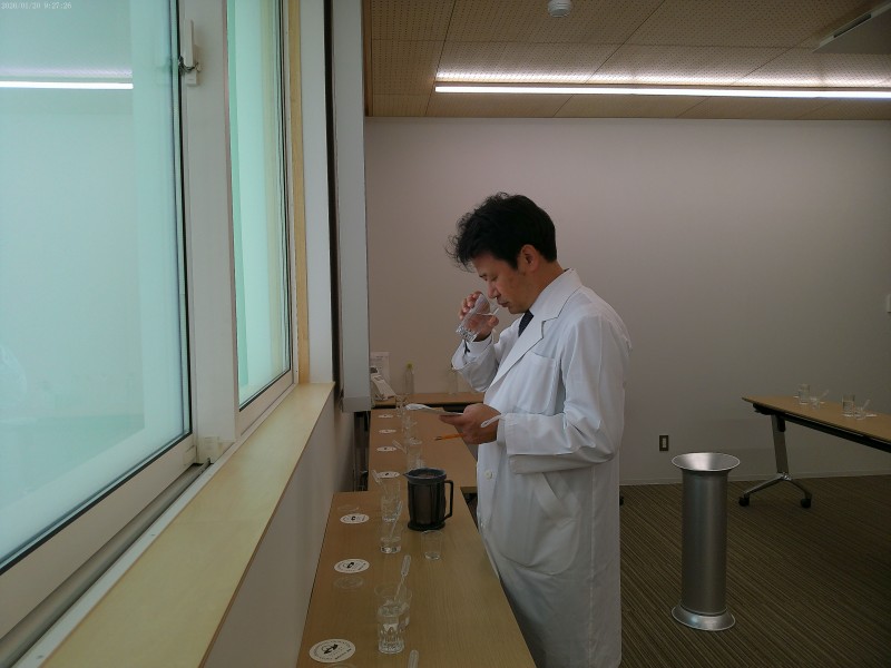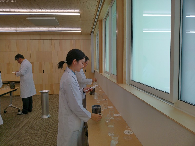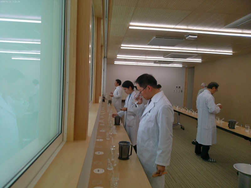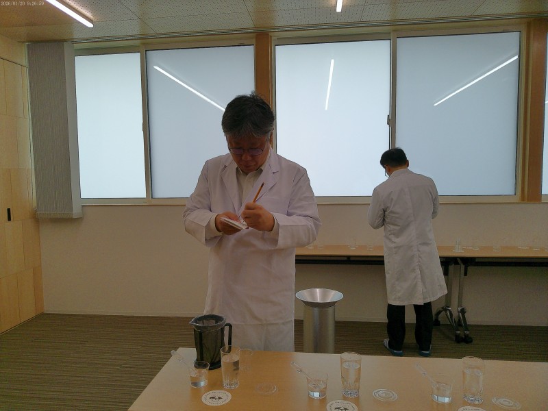 口に含む前の香りで、原料の欠点がないか、もろみの発酵や蒸留において問題がないかを確認し、また、口に含んだ時、甘みがどのくらいあるのか、味の濃さなどを確認します。最後に口から吐いた時に、渋味や苦味がどのくらいあるのかを確認します。