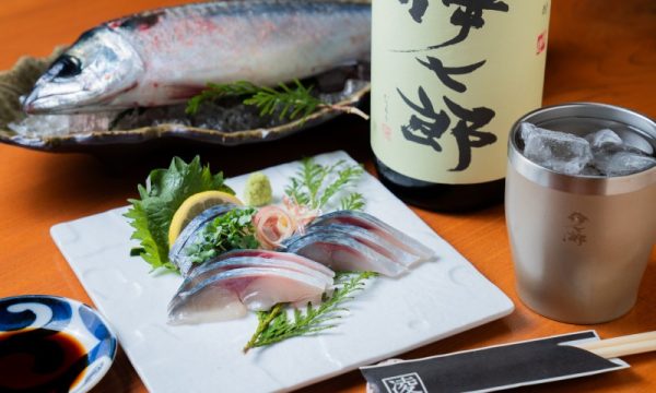 まずは、旬の「萬サバ」の刺身に、本格芋焼酎「伊七郎」を水割りで。黒瀬安光杜氏が手掛けた「伊七郎」は、2年ものと3年ものをブレンドした本格芋焼酎で、芋のふくよかな甘みと雑味のないまろやかさが特長です。ぷりっと身が締まり、甘くとろける萬サバのおいしさをやさしく引き立てます。