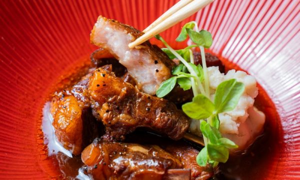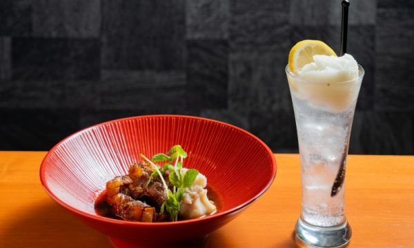 ほろっと箸でほぐせるほど柔らかく、甘辛く煮込んだスペアリブには、瀬戸内レモンのシャーベットを添えた炭酸割りの「阿久根」を。芋焼酎らしいコクを残しつつ、ソーダとレモンの爽快感で後味は軽やか。シャーベットを崩しながら味わう楽しさも魅力です。